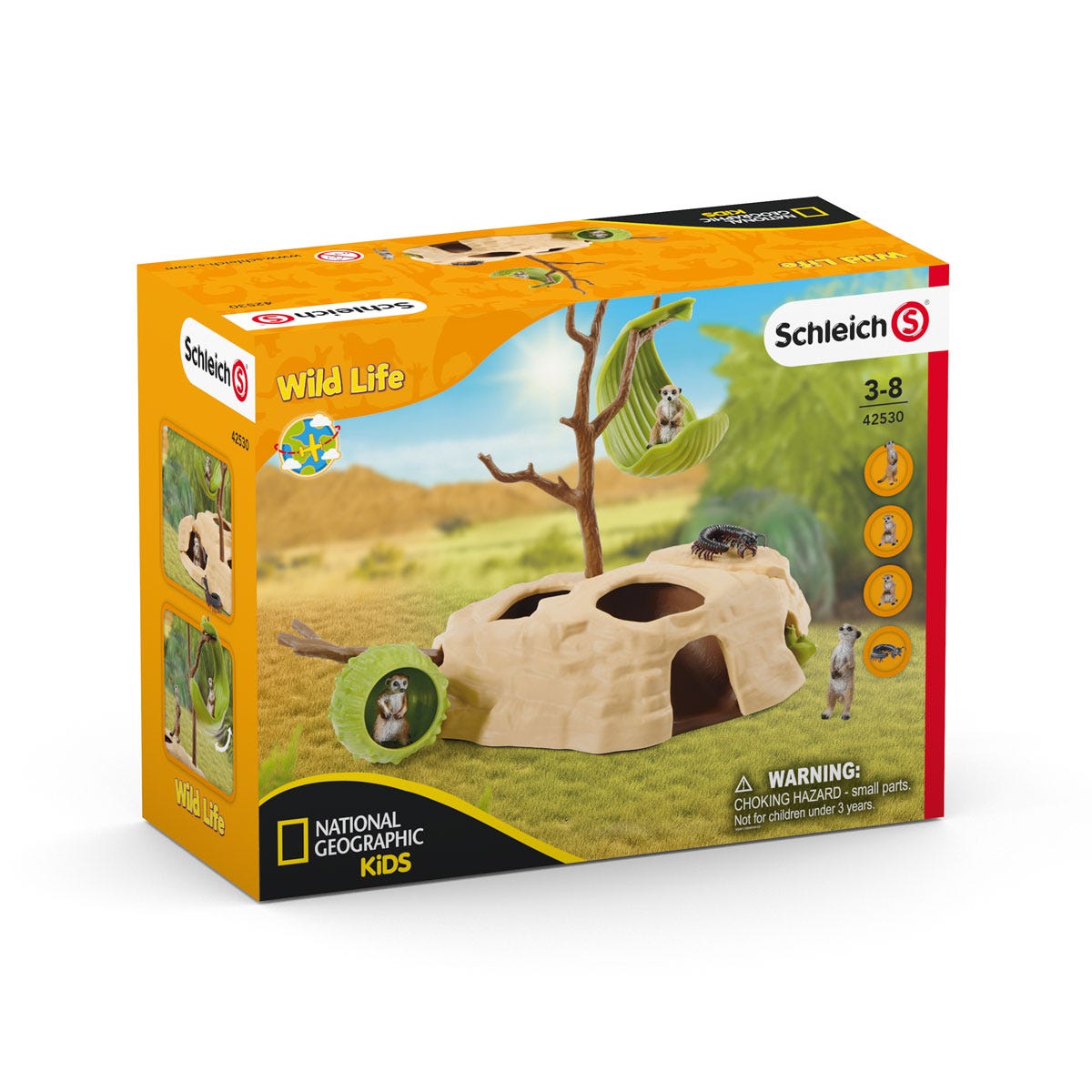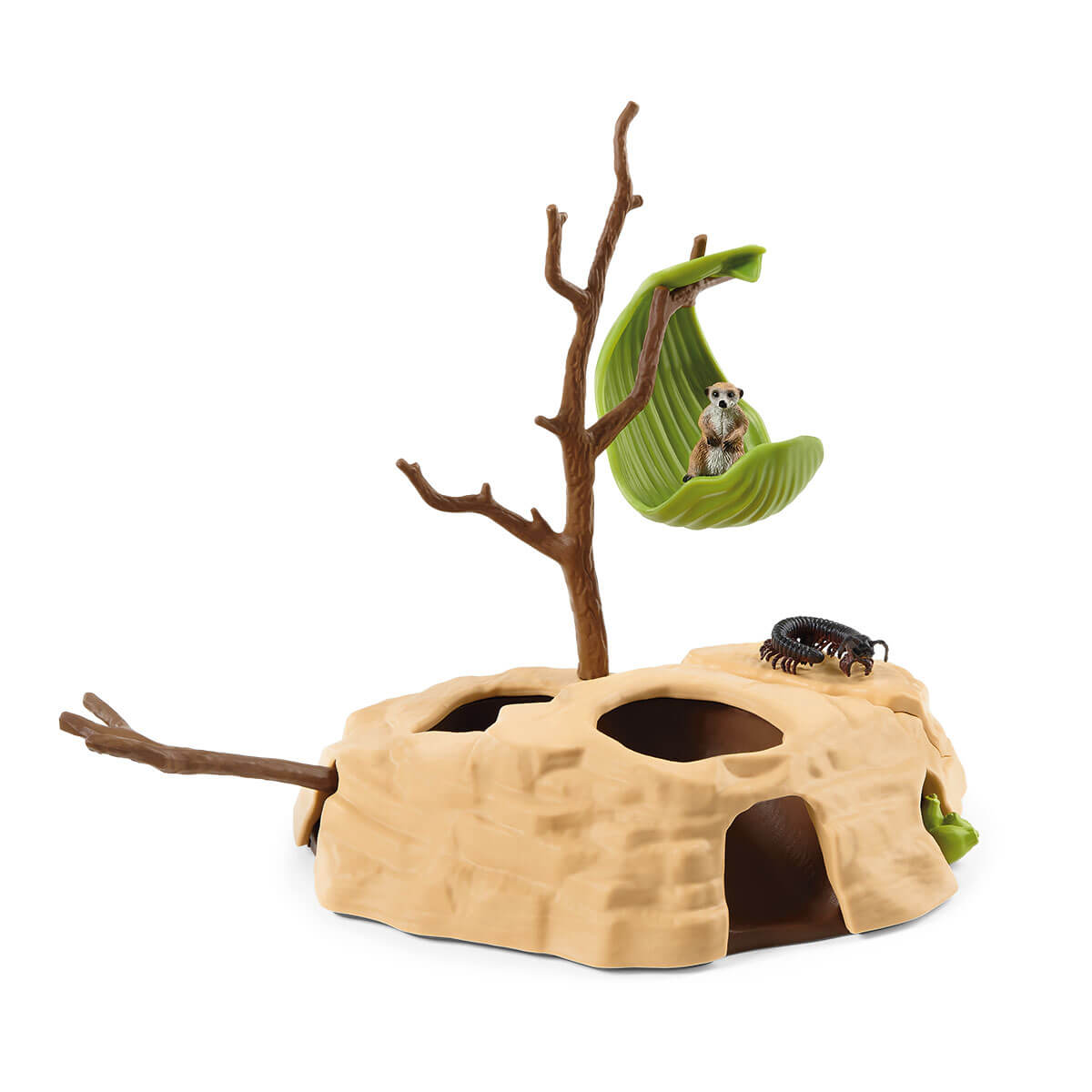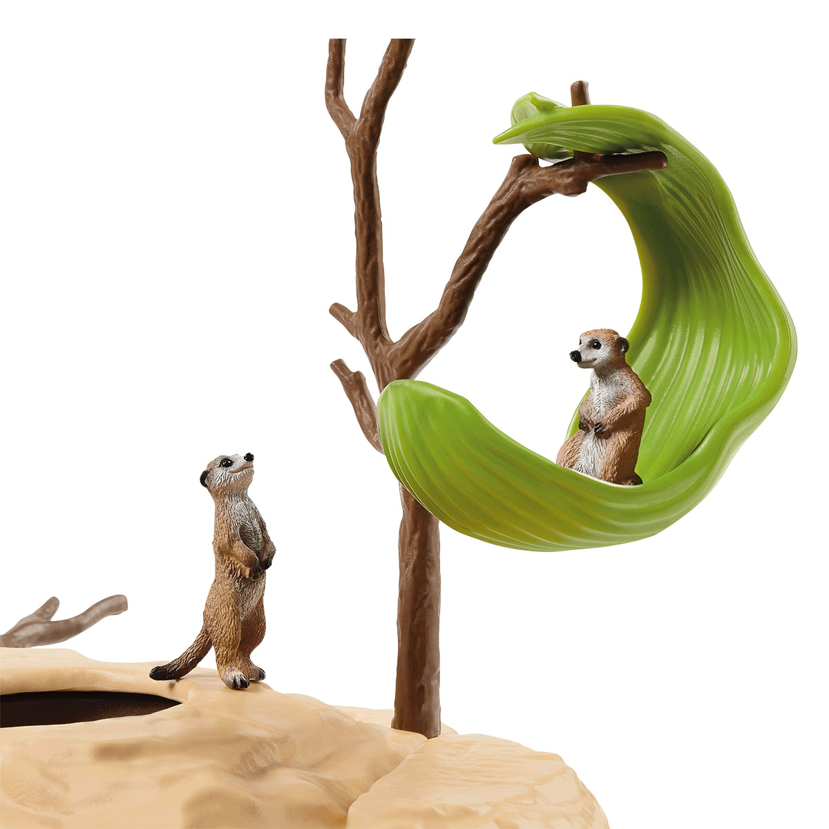 Los tres suricatas experimentan todo tipo de aventuras en el nuevo montículo de suricatas de Schleich® WILD LIFE. ¡Así, los pícaros pequeñines pueden balancearse en el balancín de ramas, deslizarse por la pendiente del montículo o jugar a esconderse alrededor de él! ¿Hay un suricata escondido dentro del melón nara? Después de tanto juego, lo primero que hay que hacer es dormir la siesta en el columpio de hojas.